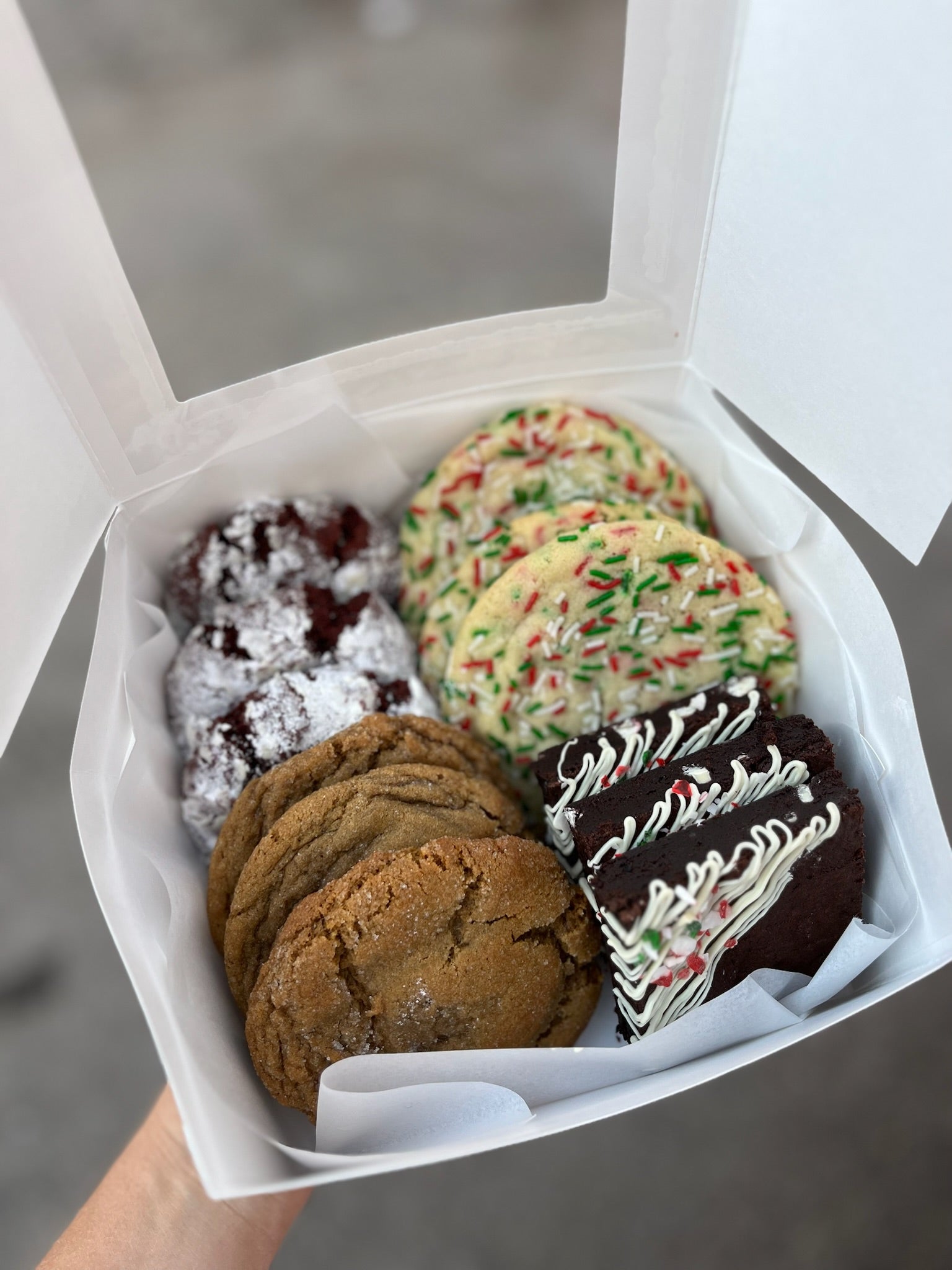 12 pieces featuring Christmas funfetti, ginger molasses, red velvet and peppermint brownies.